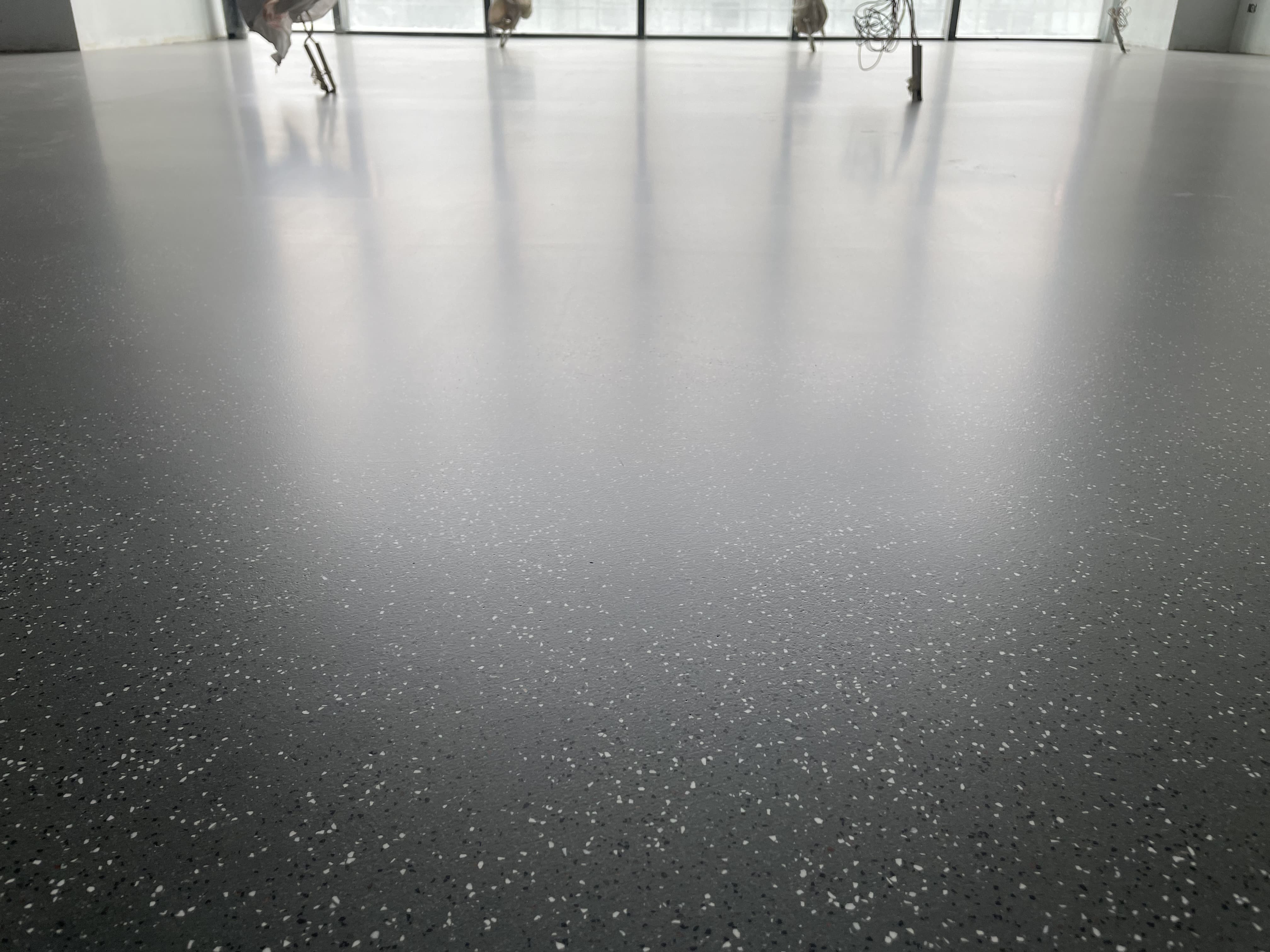 航空轮胎大科学中心项目,是以航空轮胎动力学大科学装置为核心,建设与之配套的航空轮胎博物馆、硬核科技中心。为迎合项目的调性,项目的生产车间、机房、办公室等区域地面统一设计成铁灰色的研磨彩砂地坪,满足了航空轮胎生产车间对所承载的人流和物流负荷较大、较频繁,且符合对材料防火安全性的要求。