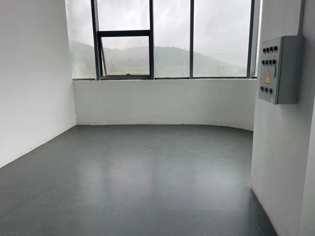 为迎合项目的调性,项目的生产车间、机房、办公室等区域地面统一设计成铁灰色,点缀以黑色金刚玉及其它高硬度颗粒,时髦的哑光面层,淡淡光泽舒适耐看。现代感十足的气质,配上整面的大落地格子窗,打造出妥妥的“工业风”。