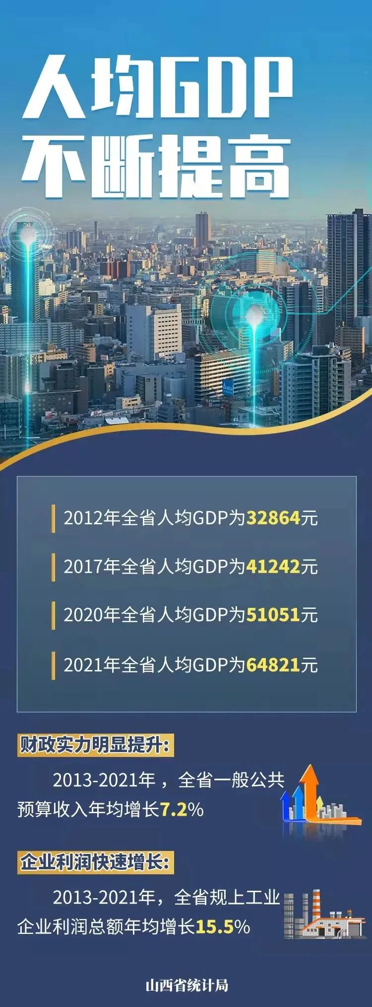 随着经济总量的不断扩大,山西人均GDP也在不断提高。从2013-2021年,全省人均GDP年均增长6.1%,快于全省经济增速,保持平稳较快增长。